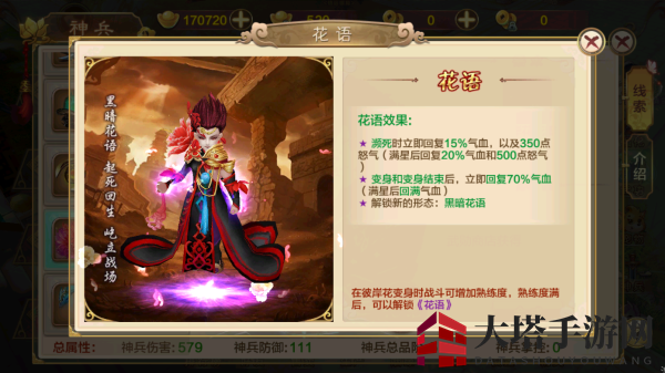 在基本属性中,是神兵伤害最高的神兵,但天赋和花语表明这个神兵更倾向于辅助输出,变身满血,解除变身还是满血,血量危险的情况下,一发变身就会让敌人感到绝望。